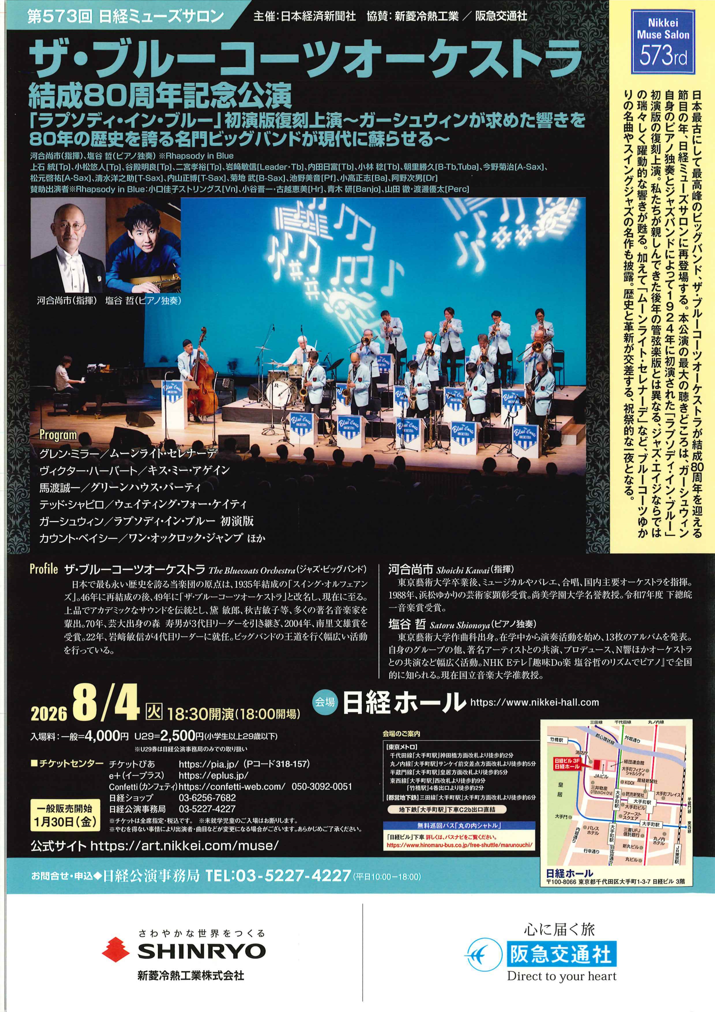 結成80周年記念公演出演:ザ・ブルーコーツオーケストラ 指揮:河合尚市 ピアノ:塩谷 哲 MC:重本昌信おもな演奏曲目